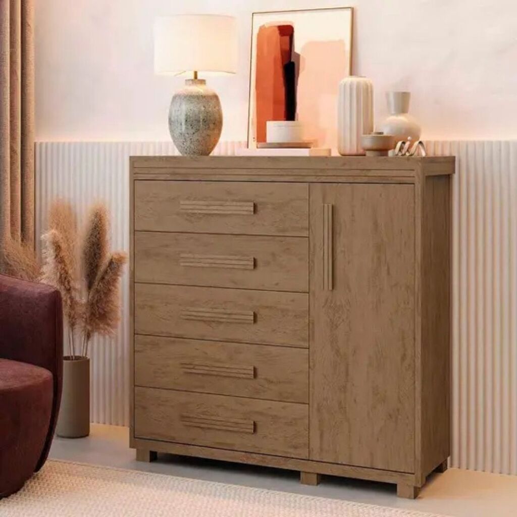 Ela conta com 5 gavetas resistentes em MDF, equipadas com corrediças telescópicas que garantem abertura suave e durabilidade, além de puxadores modernos que dão um toque de sofisticação.