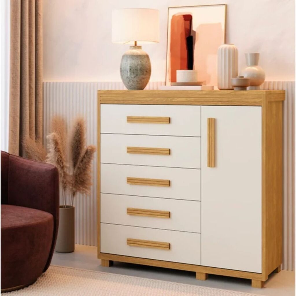 Ela conta com 5 gavetas resistentes em MDF, equipadas com corrediças telescópicas que garantem abertura suave e durabilidade, além de puxadores modernos que dão um toque de sofisticação.