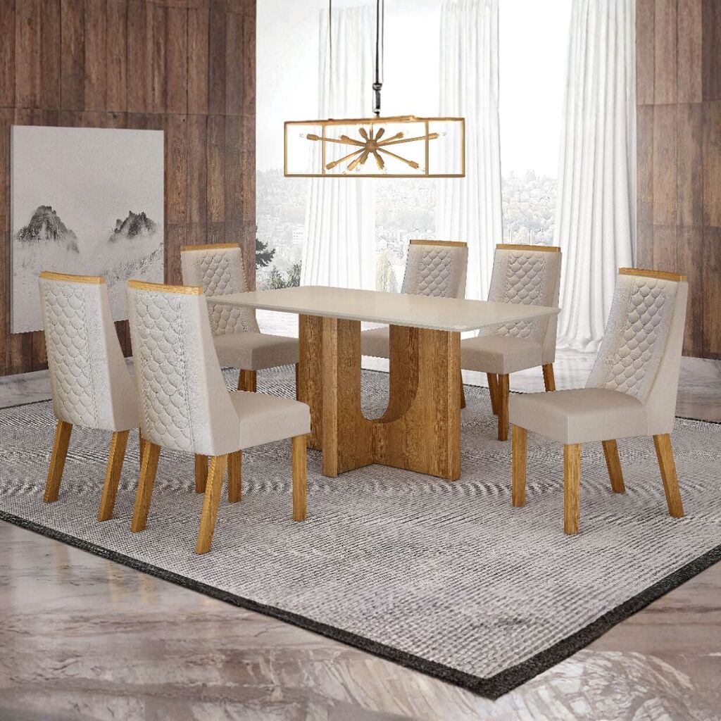 A mesa possui base em MDF e tampo robusto de 25 mm, garantindo resistência, durabilidade e estabilidade. O conjunto acompanha 6 cadeiras estofadas, que oferecem o conforto necessário para refeições prolongadas e momentos especiais em família.