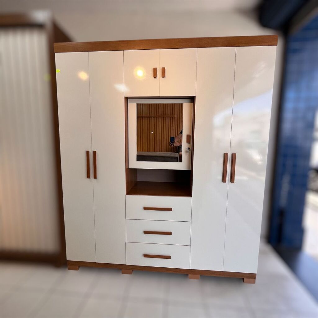 Com duas portas laterais de cada lado, duas portas superiores e uma porta central com espelho e chave, ele garante organização, segurança e um toque sofisticado ao seu quarto.
