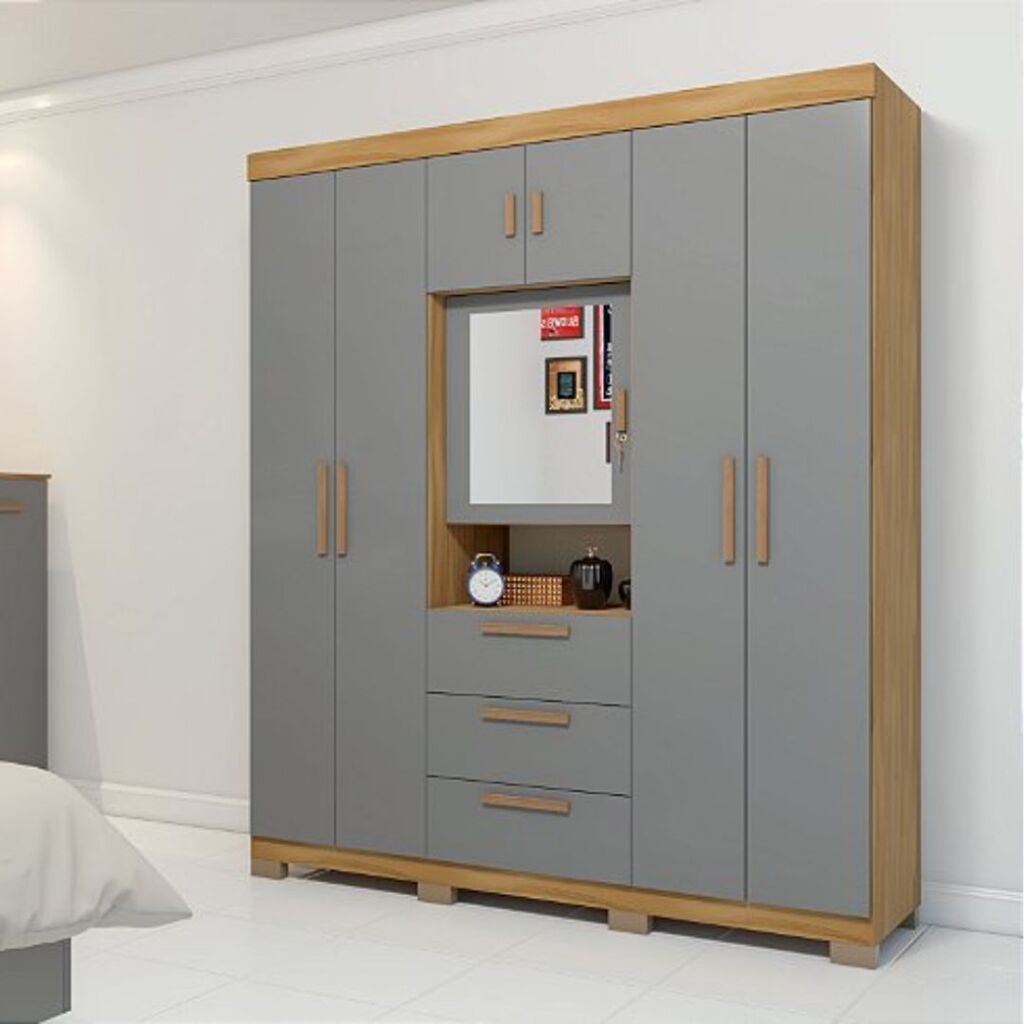 Com duas portas laterais de cada ladoduas portas superiores e uma porta central com espelho e chave, ele garante organização, segurança e um toque sofisticado ao seu quarto.